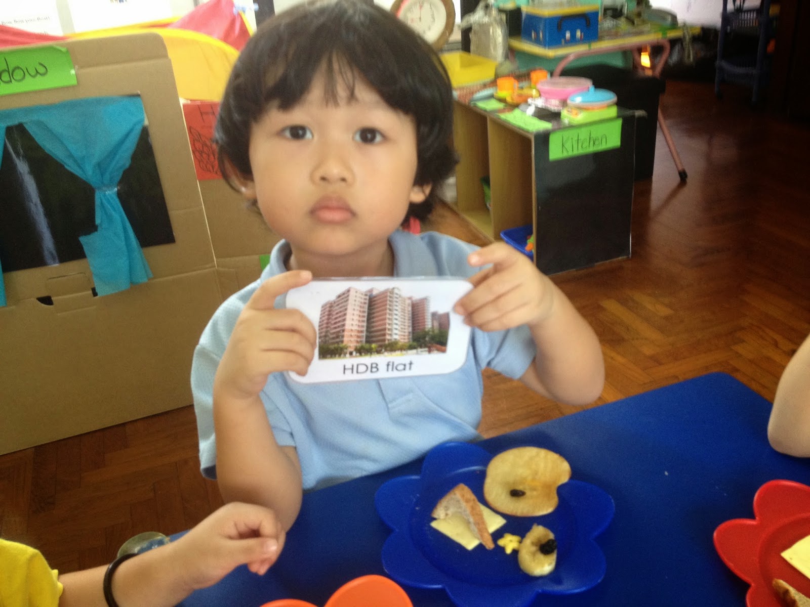Jovan had so much to share about the activities he does around his house and neighbourhood. He mentioned that he lives in a HDB flat and loves to play at the playground near his house. He formed a HDB flat and said the raisins on the bread are windows.